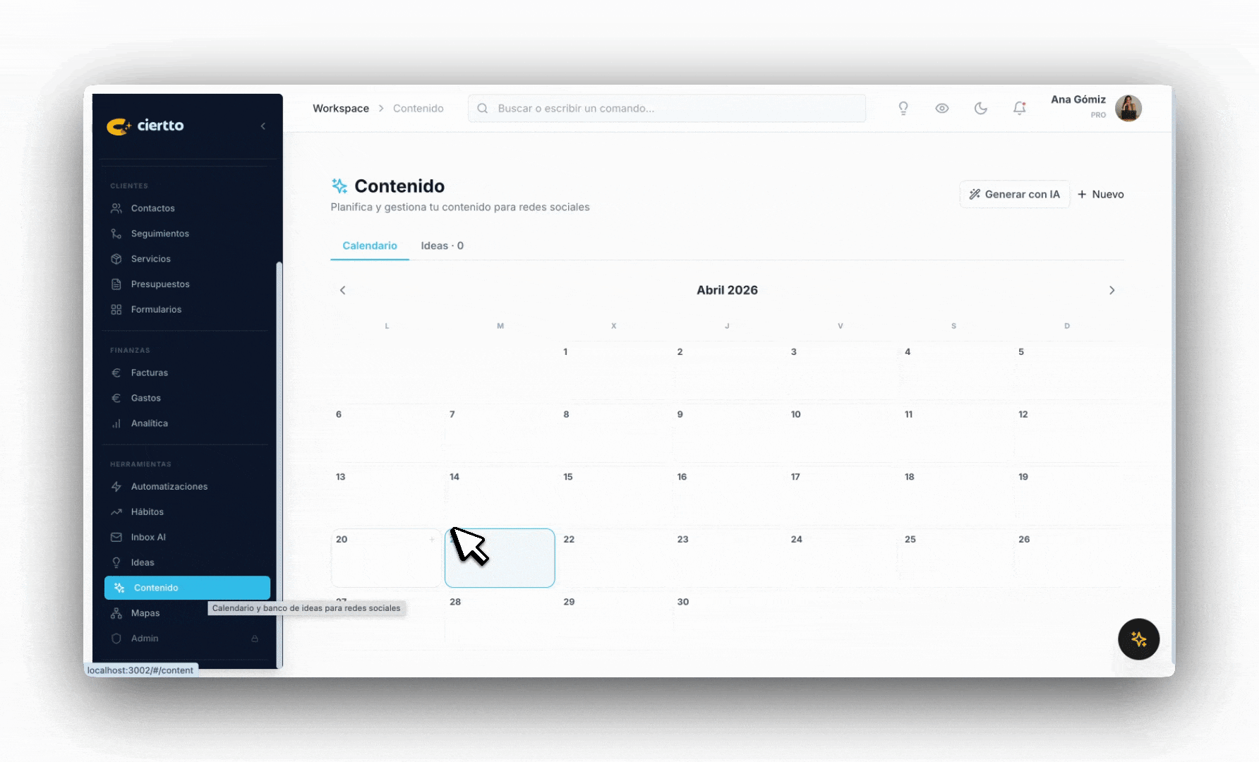 Una de las cosas que más echaba en falta era tener un sitio dentro de Ciertto donde planificar mi contenido. Tenía una hoja de cálculo, una app por aquí, notas de voz por allá... y al final nunca sabía qué tenía publicado, qué estaba a medias y qué era solo una idea suelta.