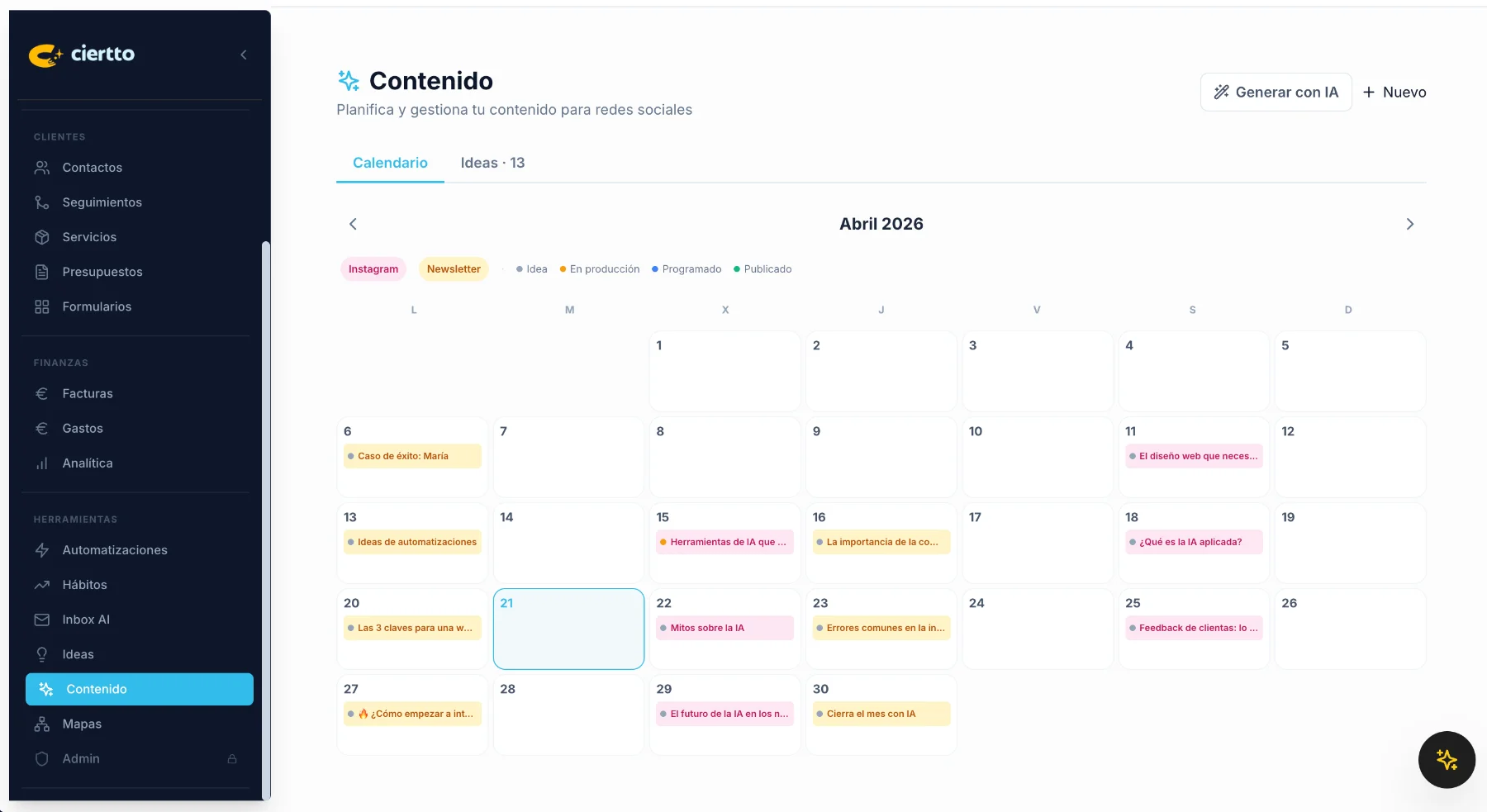 Ya no. El módulo de Contenido es un calendario editorial integrado en Ciertto donde puedo planificar todo lo que quiero publicar, por canal y formato, con estado en tiempo real.